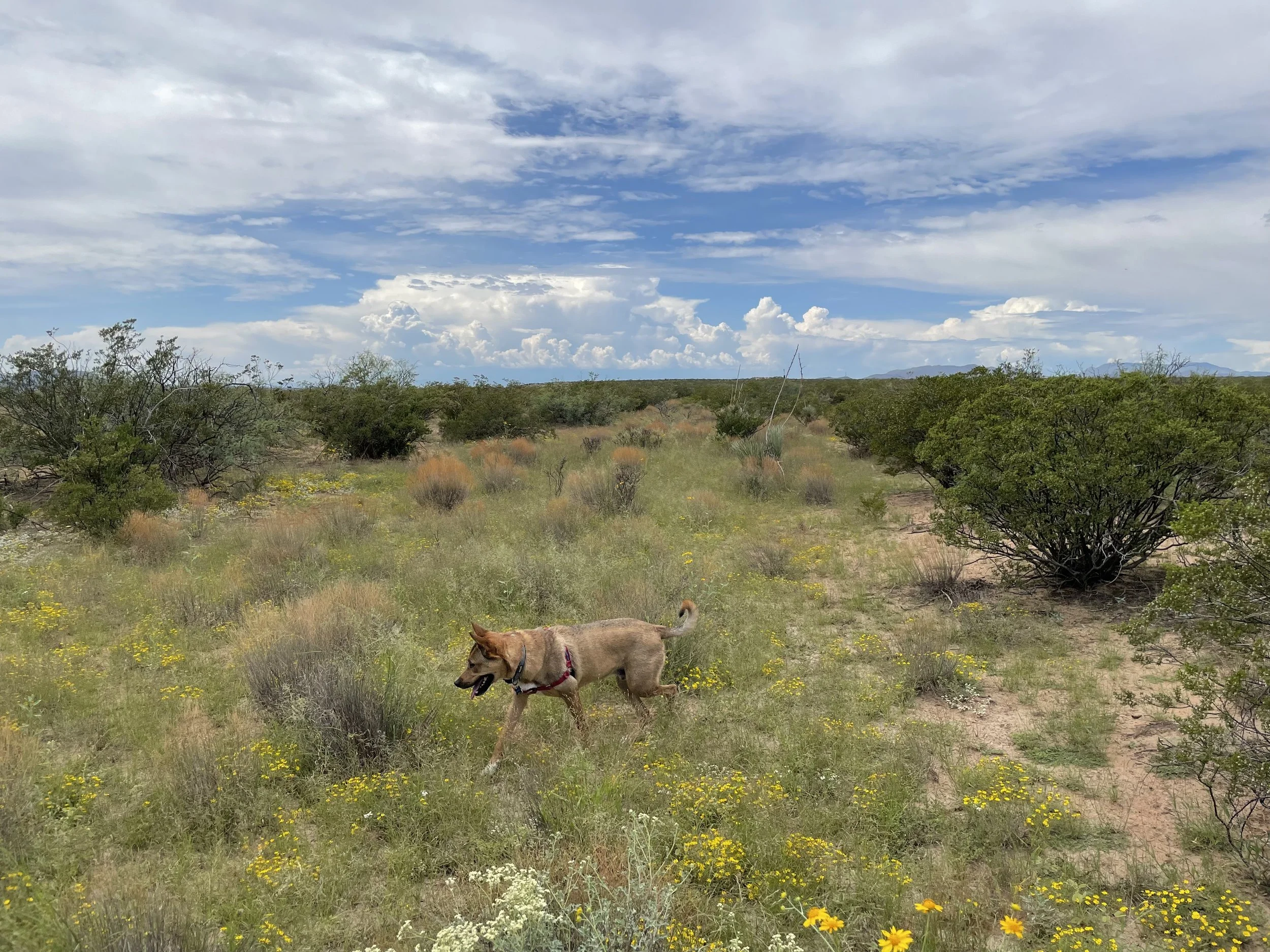 Cody Dalpra’s dog in a trail cut of the Camino Real. The vegetation difference shows the cut of the trail well. Photo by Cody Dalpra