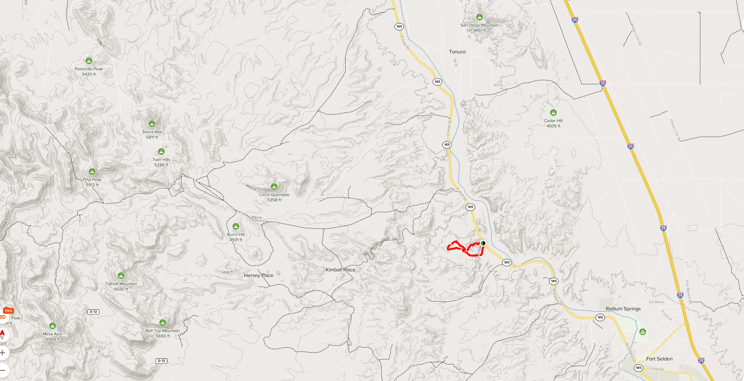 If you prefer to meet-up at the trail head, use these directions: Take I-10 West toward Las Cruces, Take I-25 North to the Radium Springs Exit 19. Turn left and go 1.7 miles. Turn right onto North Valley Drive--Hwy 185 and drive about 5 miles. There will be a green gate on the left. Parking is along the road.