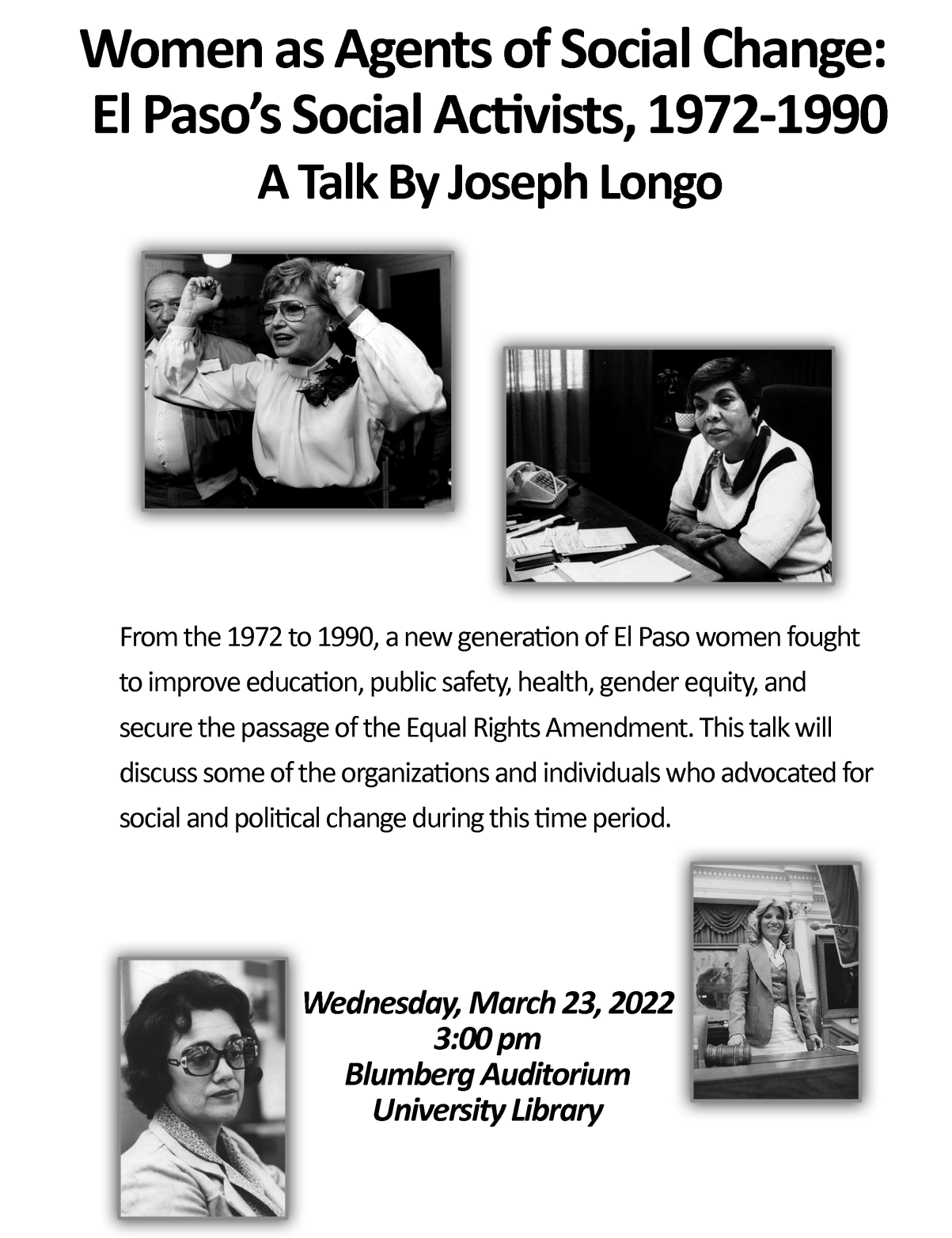 Women as Agents of Social Change: El Paso's Social Activists, 1972-1990 Wednesday, March 23, 2022 3:00β―PM 4:00β―PM Google Calendar ICS