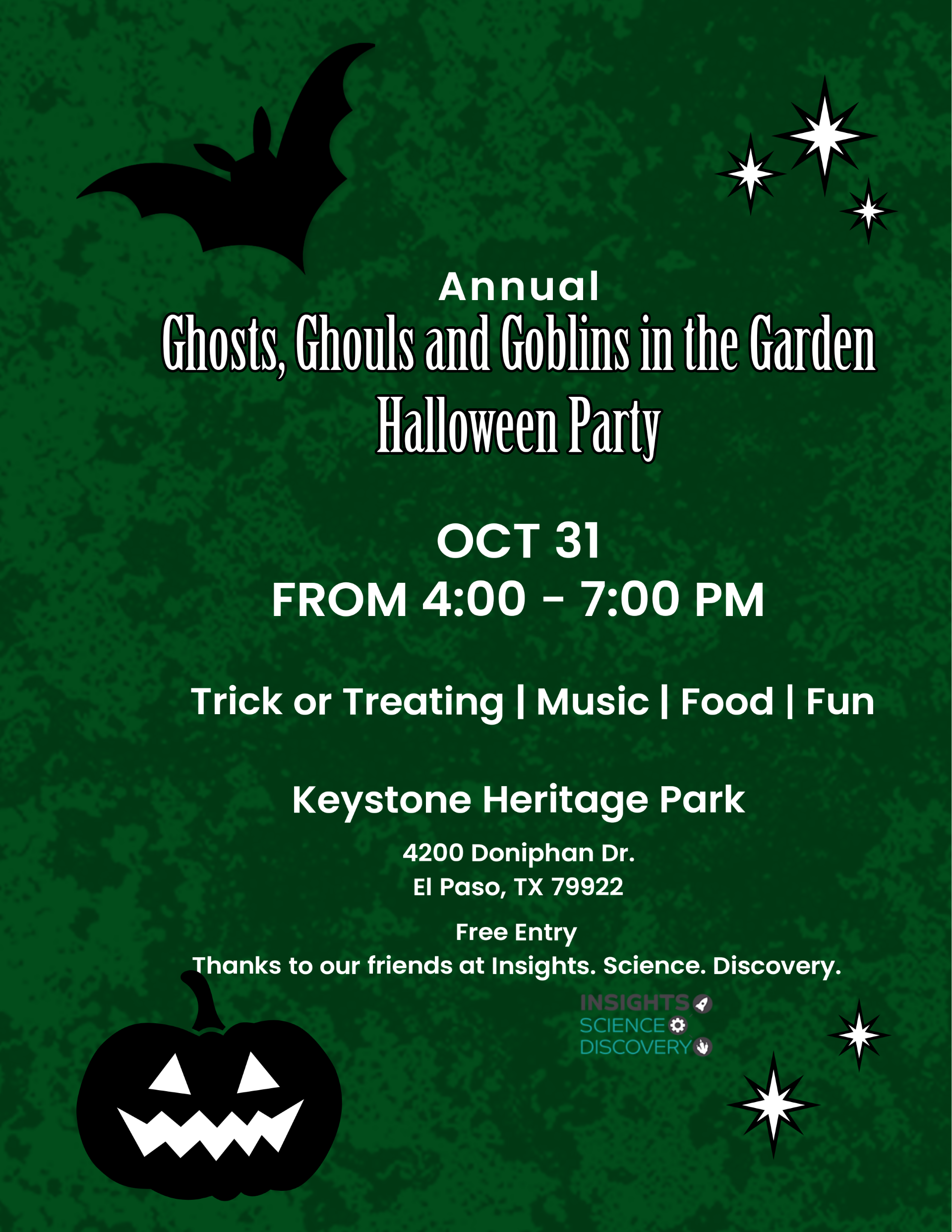 Ghosts, Ghouls and Goblins in the Garden Halloween Party Tuesday, October 31, 2023 4:00β―AM 7:00β―PM Keystone Heritage Park 4200 Doniphan Drive El Paso, TX, 79922 United States (map) Google Calendar ICS