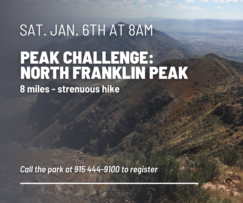 This month we will hike to North Franklin Peak beginning at the W. Cottonwood Springs trailhead. This is a very strenuous hike of about 8 miles. It begins with a gradual incline over scree, or rubble, proving to be challenging for some; then transitions to a steady climb over loose rubble/rocks. Continue to meander across the ridgeline to the highest peak in the park, North Franklin Peak! Bring your camera, the views are unbelievable with a 360 perspective of our region –with views of Mexico, the City of El Paso, and into New Mexico.
