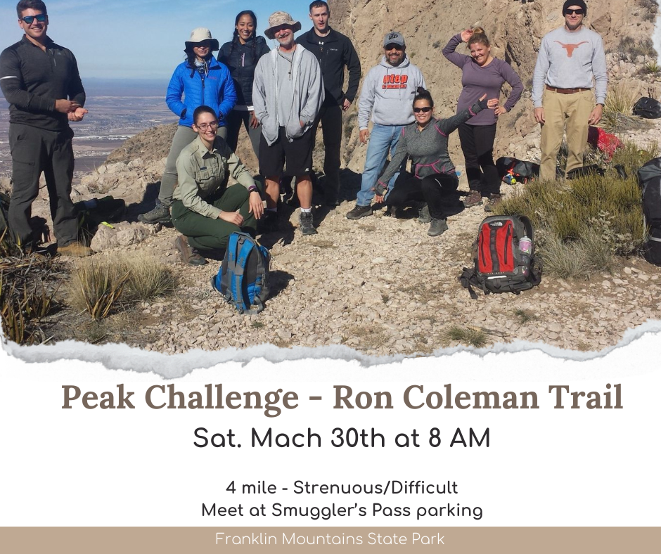 This month we will hike the newly re-opened Ron Coleman trail. This is a very strenuous hike of about 4 miles. Considered by some to be the most difficult trail in Franklin Mountains State Park, this trail begins in McKelligon Canyon with a moderately steep incline over loose gravel and rocks leading to two natural rock shelters. After reaching the first cave, the trail hooks around on the right side and requires scrambling on all fours over bare rock to make it up to the second cave very near the ridgeline. The ridgeline provides a respite as you wander along the gentle rise which continues until you reach three sections of chain assisted rock ascents ranging from 15-40 feet. Be sure to stop in the middle of the second ascent to enjoy the view out the window! Shortly afterwards you will pass South Franklin Peak and make your way to “Mammoth rock.” The descent from the Mammoth can be very difficult to pick out and is steep and rocky. Once you reach the bottom, it is a short stroll to the Smuggler’s Pass Parking area off of Transmountain Road.