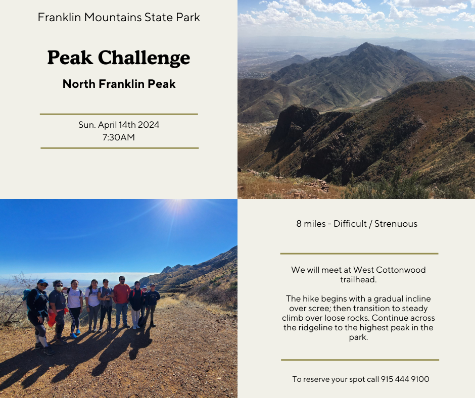This month we will hike to North Franklin Peak beginning at the W. Cottonwood Springs trailhead. This is a very strenuous hike of about 8 miles. It begins with a gradual incline over scree, or rubble, proving to be challenging for some; then transitions to a steady climb over loose rubble/rocks. Continue to meander across the ridgeline to the highest peak in the park, North Franklin Peak! Bring your camera, the views are unbelievable with a 360 perspective of our region –with views of Mexico, the City of El Paso, and into New Mexico.