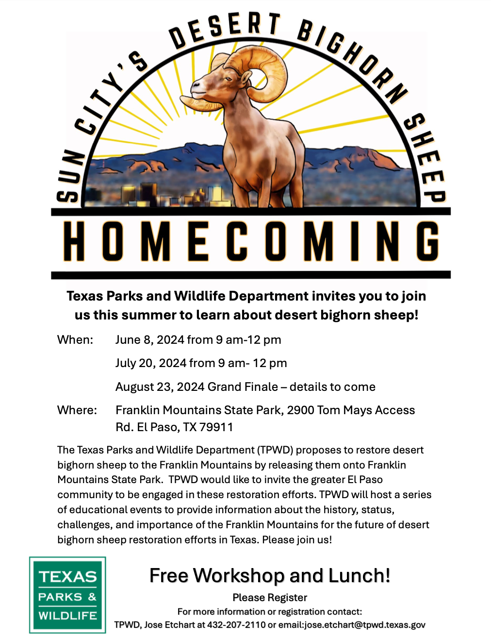 The Texas Parks and Wildlife Department (TPWD) proposes to restore desert bighorn sheep to the Franklin Mountains by releasing them onto Franklin Mountains State Park. TPWD would like to invite the greater El Paso community to be engaged in these restoration efforts. TPWD will host a series of educational events to provide information about the history, status, challenges, and importance of the Franklin Mountains for the future of desert bighorn sheep restoration efforts in Texas.