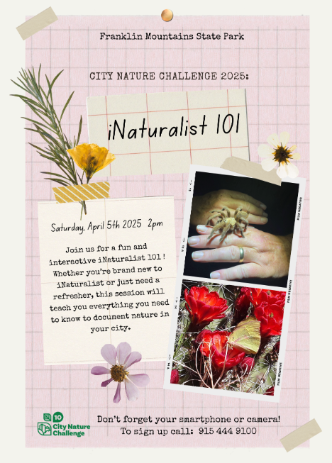 Bring: cell phone with iNaturalist installed, water, snacks, hiking boots/shoes, and comfortable clothes.