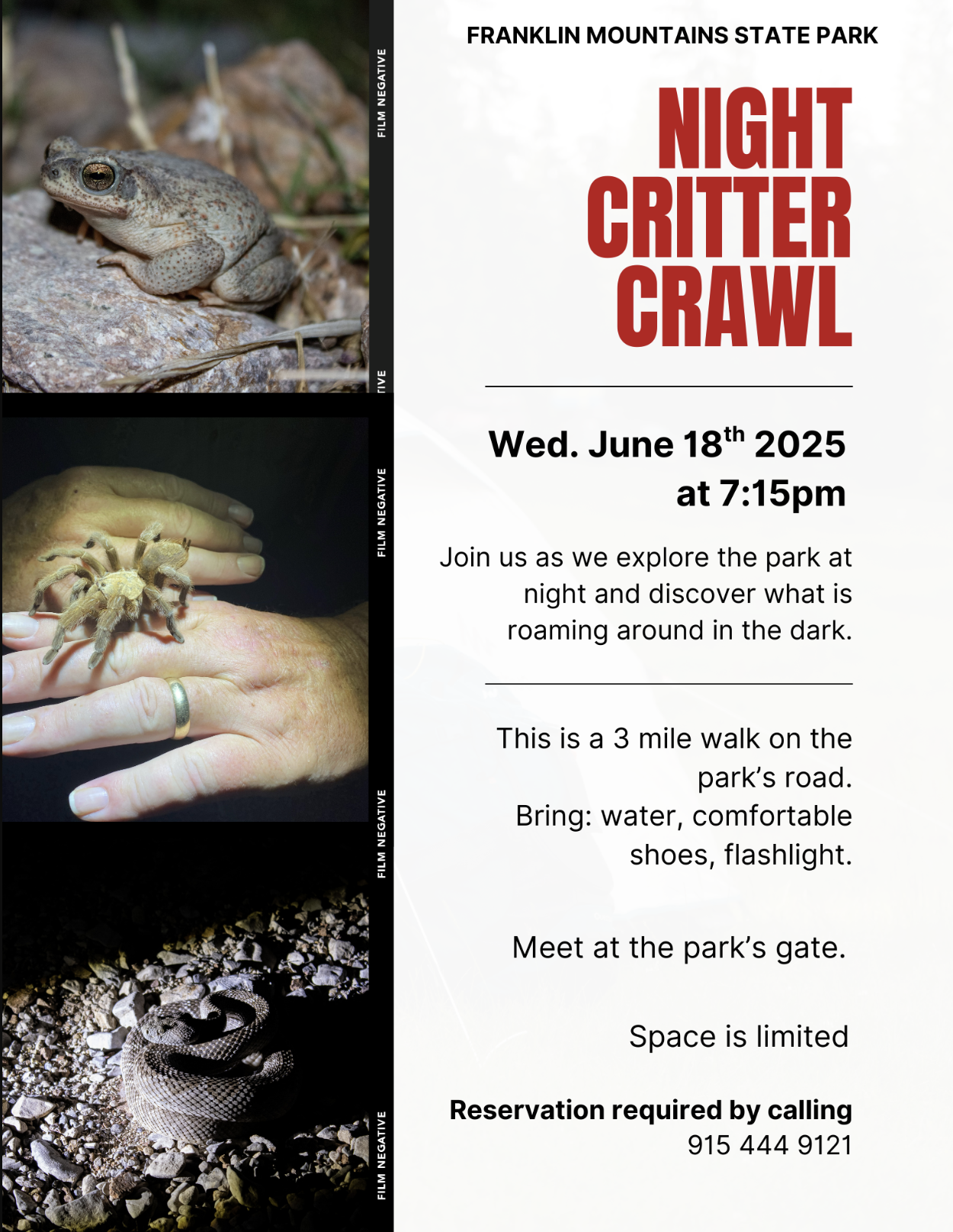 Reservations are required; to make you reservation, call (915) 444-9121 Monday through Friday. 8:00 am - 4:00 pm. Space is limited (15 spots).