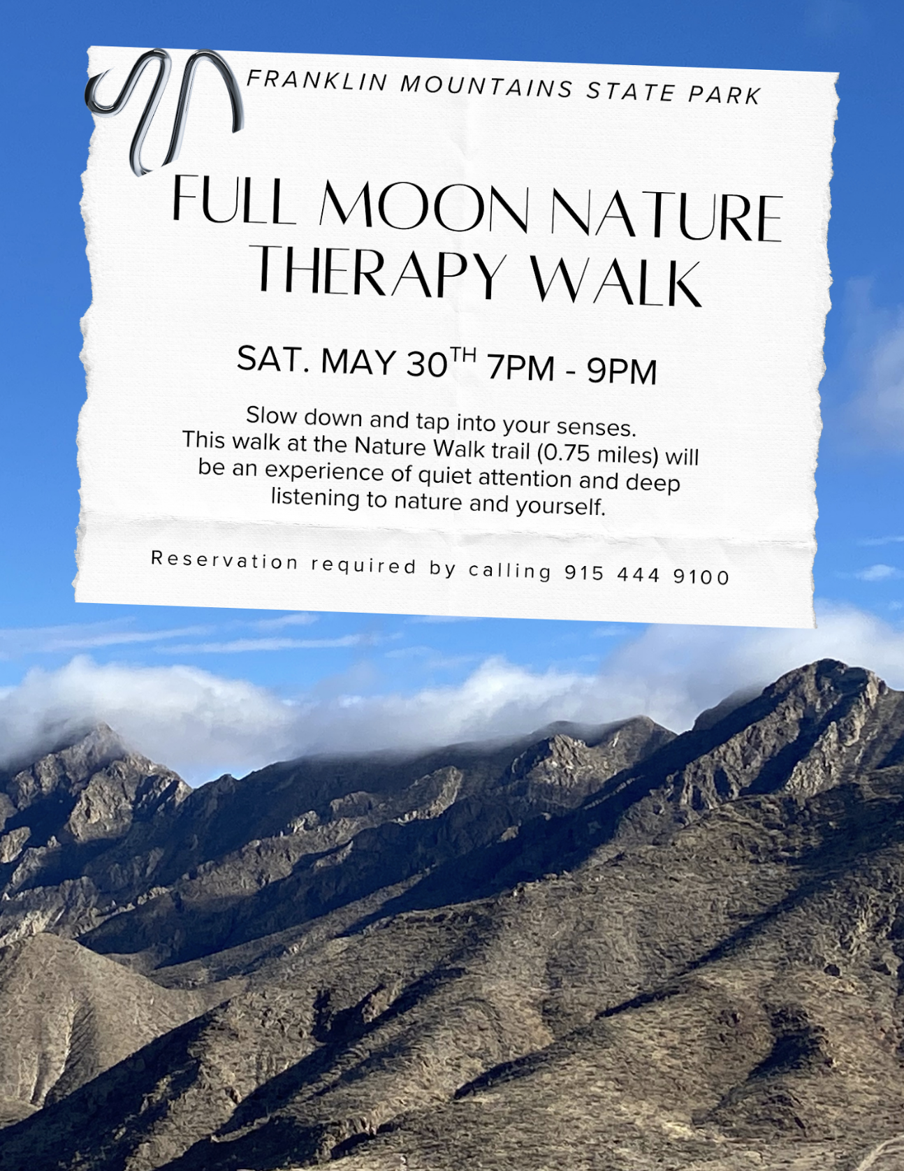 Enjoy a full moon guided nature therapy walk in Franklin Mountains State Park. This is an opportunity to slow down